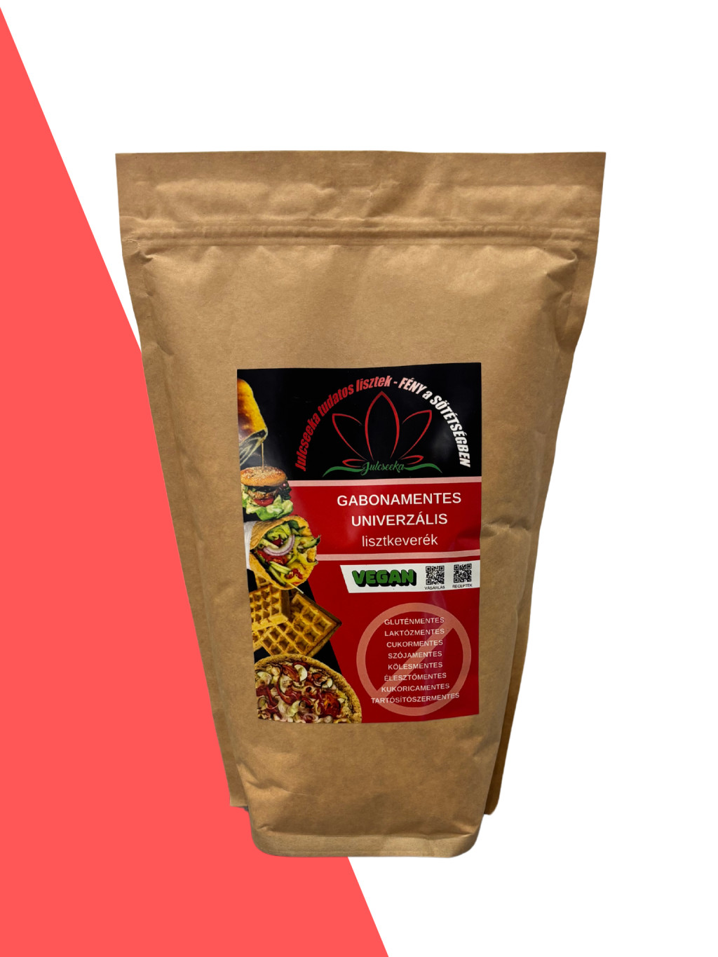 A Termék : -gluténmentes , -tejmentes ,-tojásmentes , -kukoricamentes ,-szójamentes ,-köles mentes , -cirok mentes ,-cukor mentes , ,-édesítőszer mentes , -vegan
